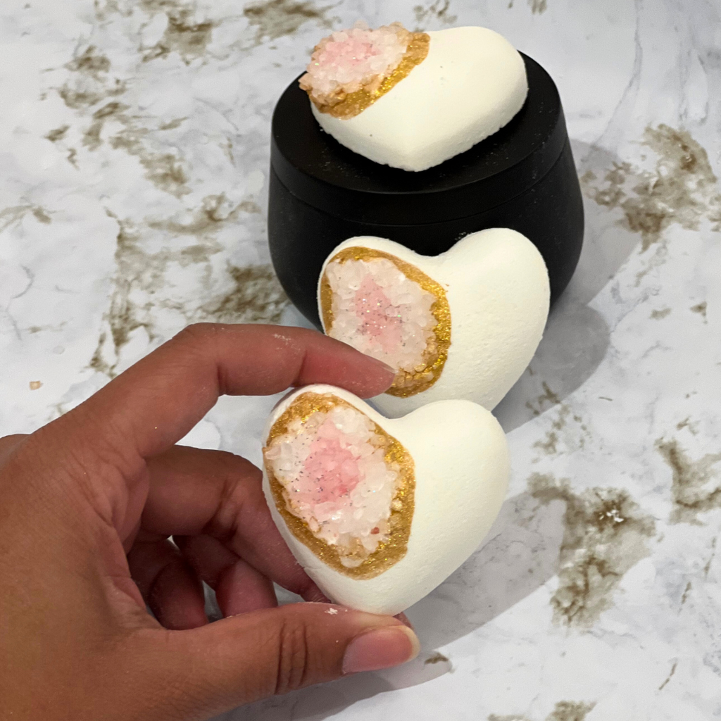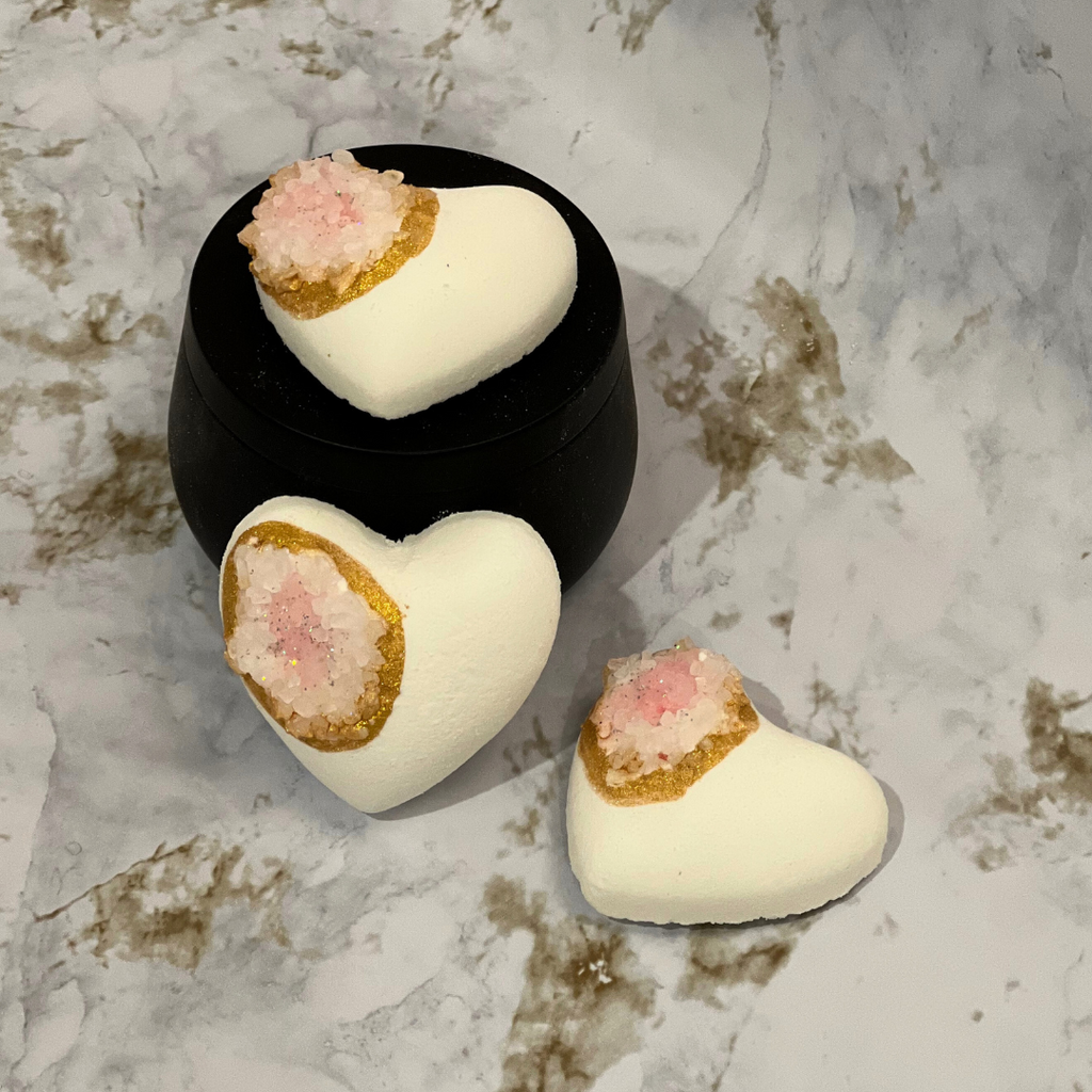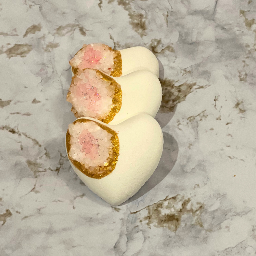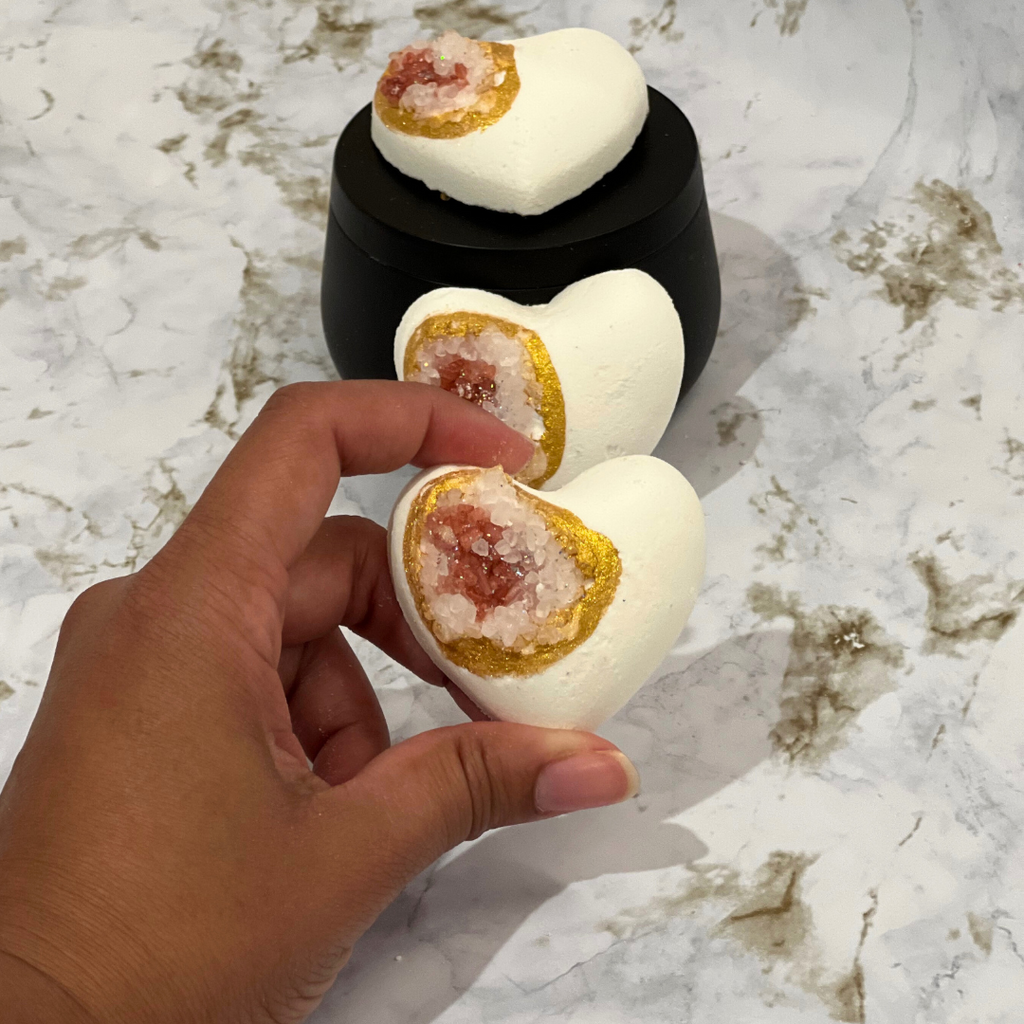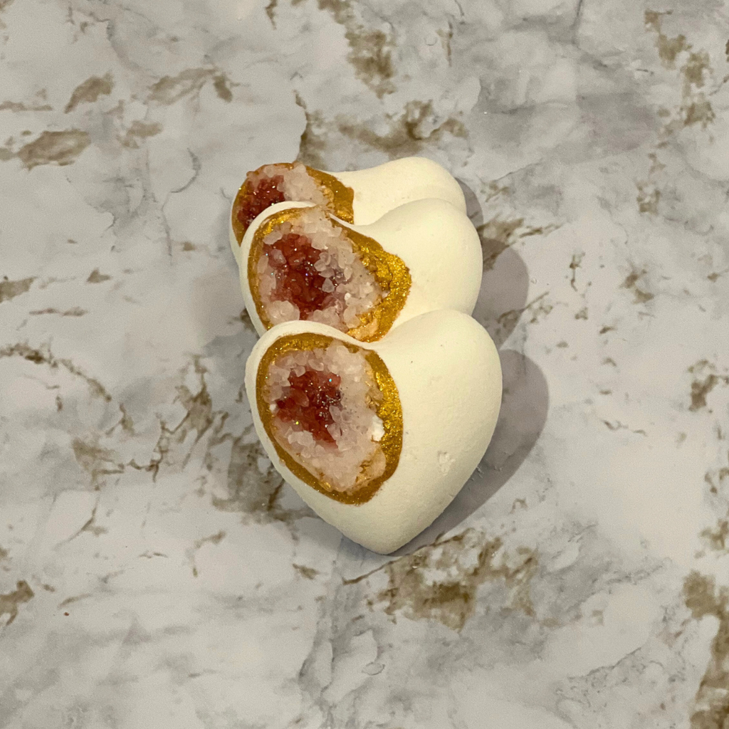 You’ll receive three mini heart geodes, each packed with skin-loving ingredients and a touch of shimmer, giving you all the benefits of our premium bath bombs — just in a smaller dose.