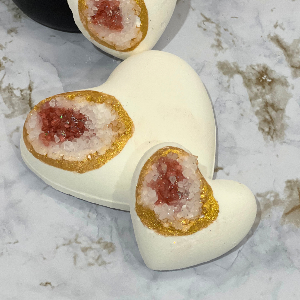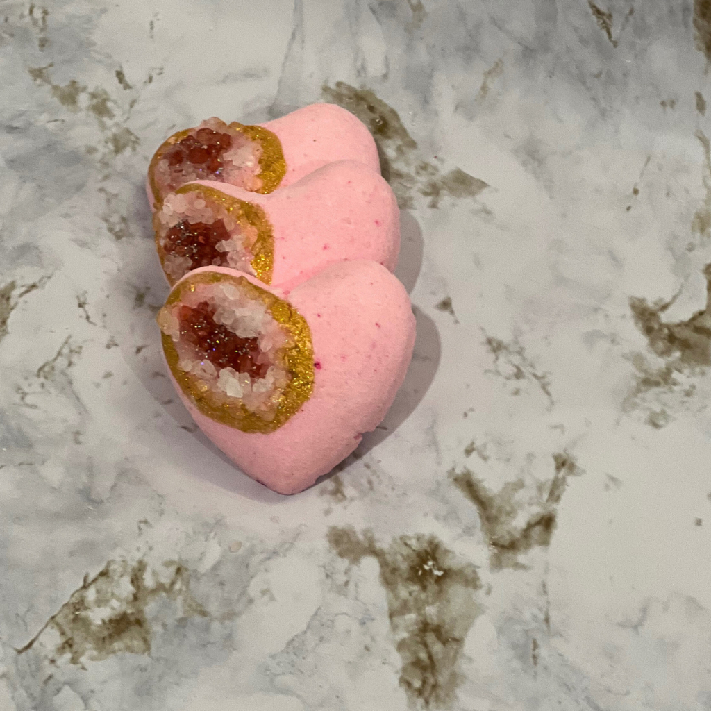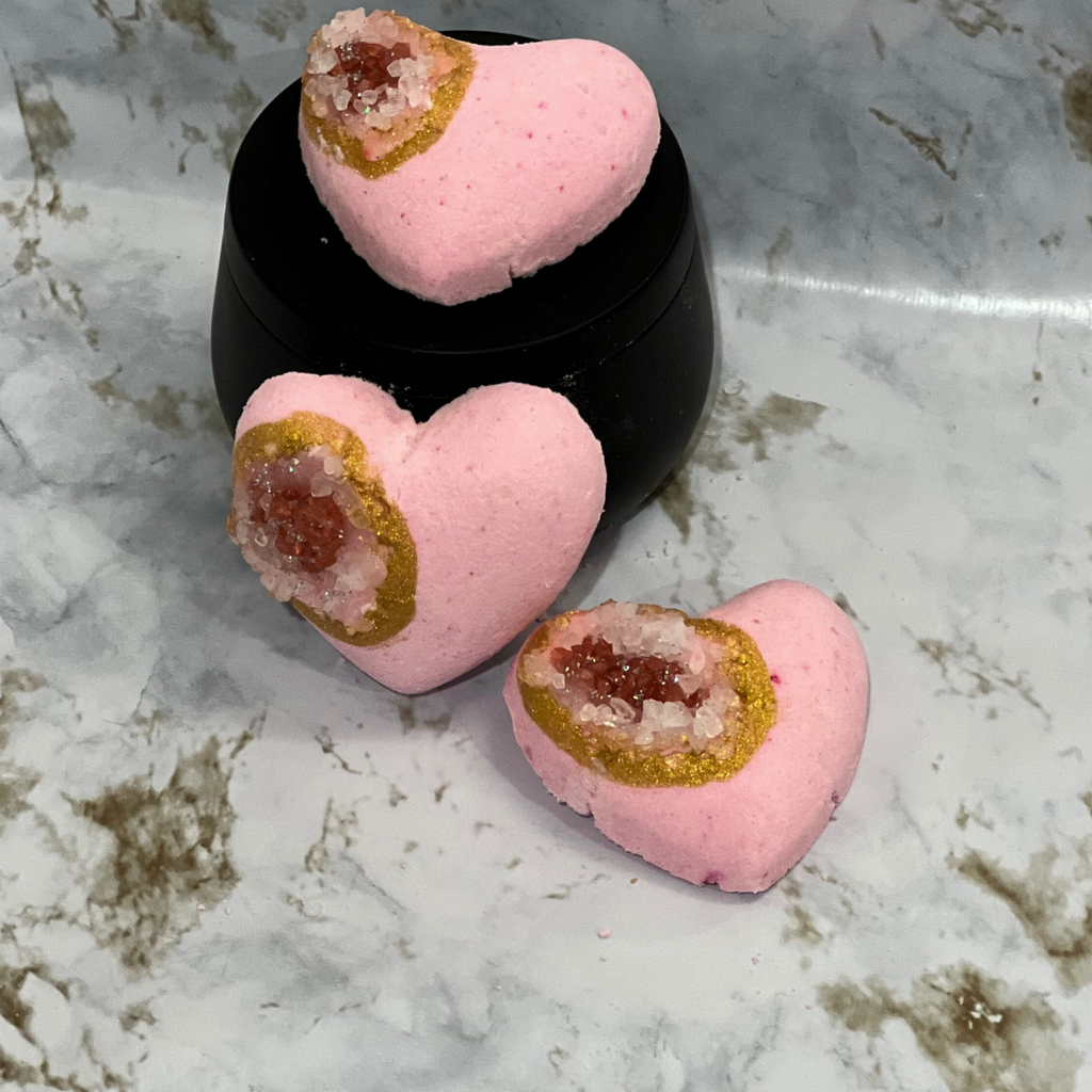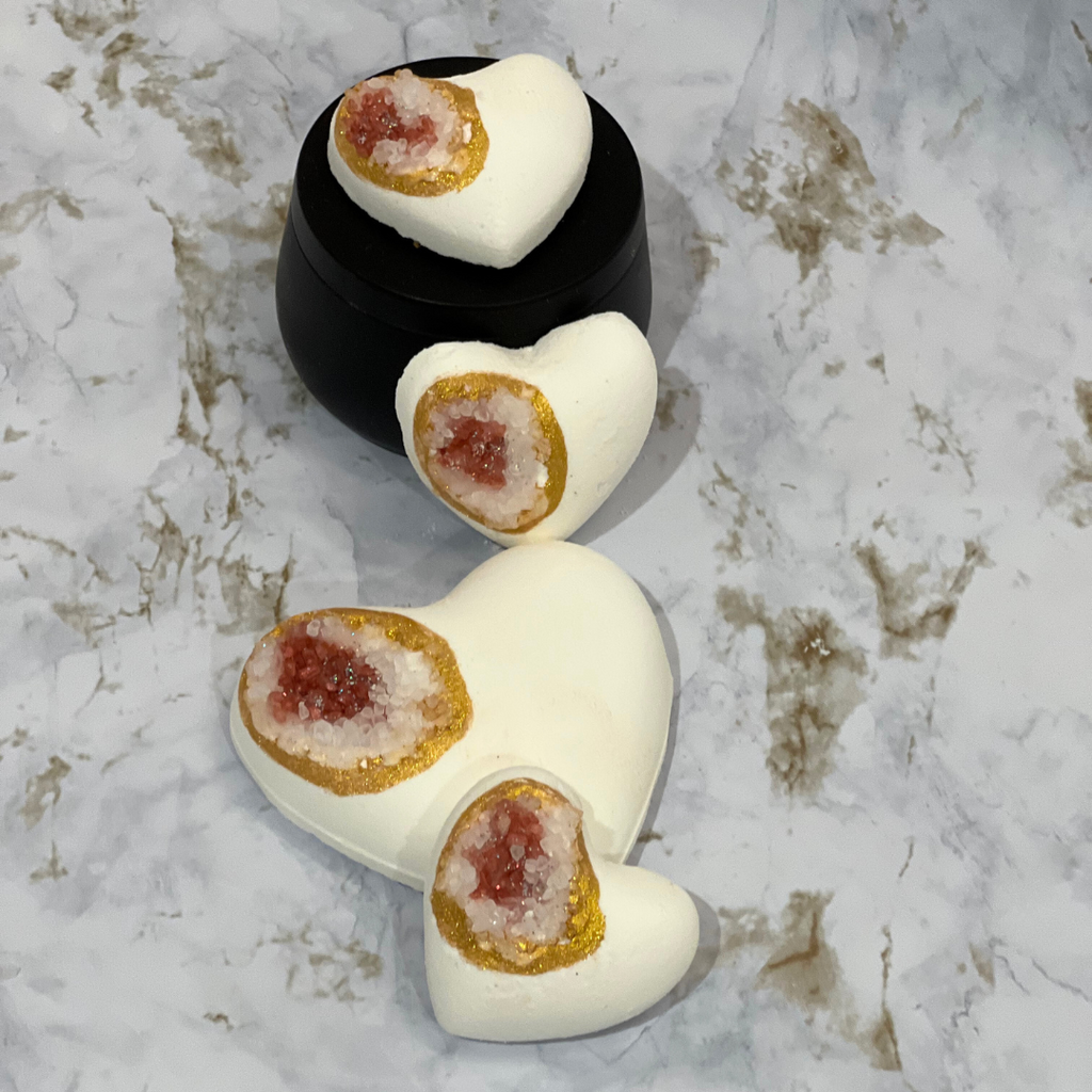 You’ll receive three mini heart geodes, each packed with skin-loving ingredients and a touch of shimmer, giving you all the benefits of our premium bath bombs — just in a smaller dose.