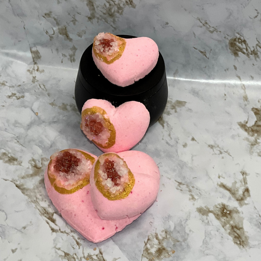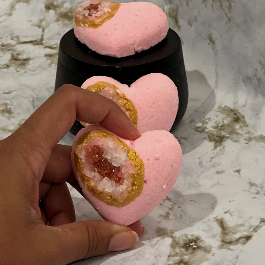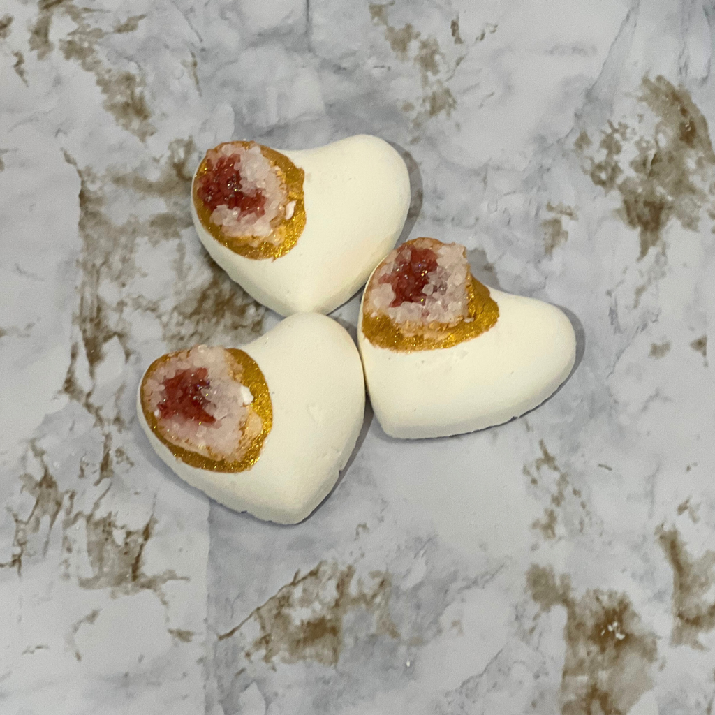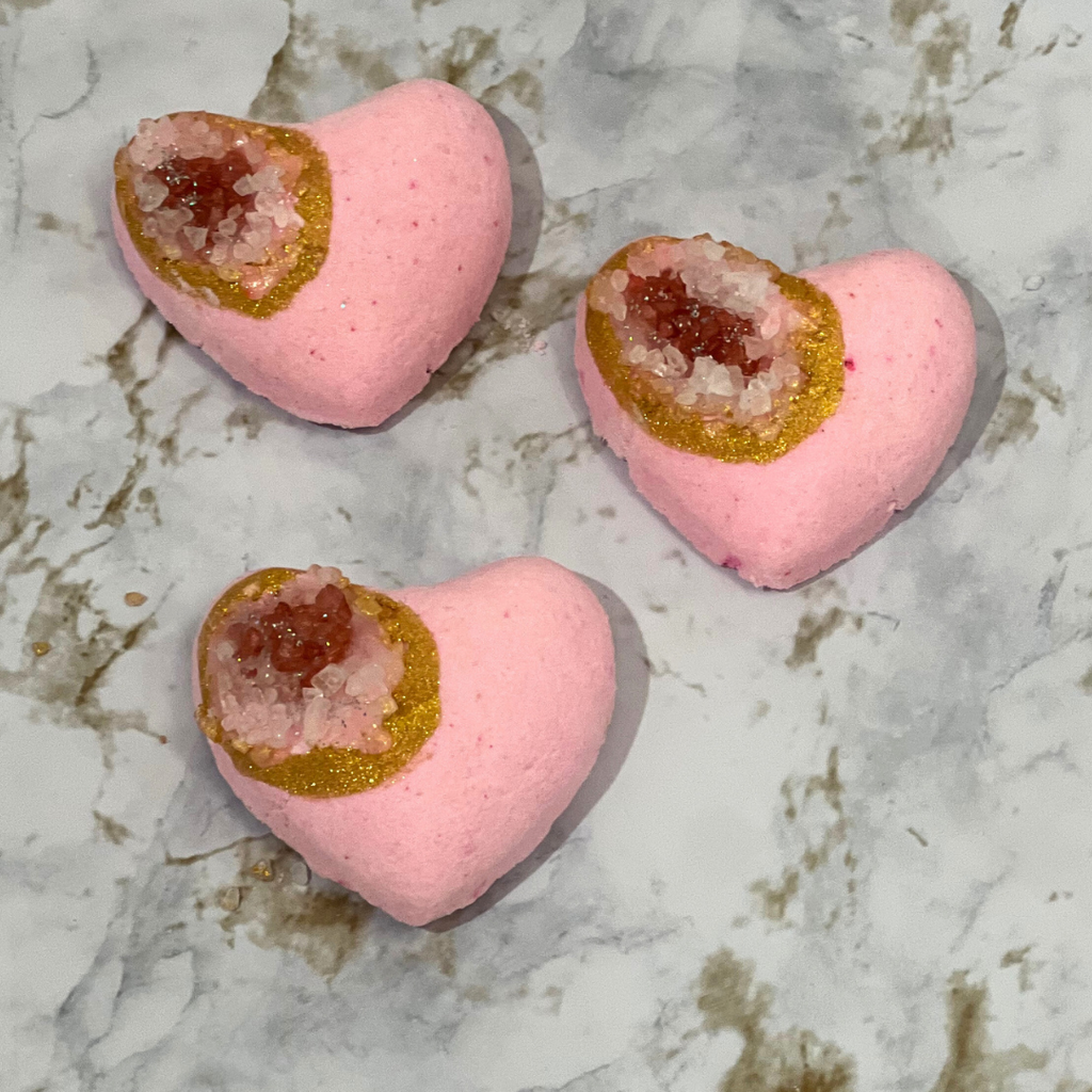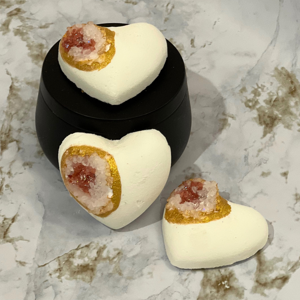 You’ll receive three mini heart geodes, each packed with skin-loving ingredients and a touch of shimmer, giving you all the benefits of our premium bath bombs — just in a smaller dose.