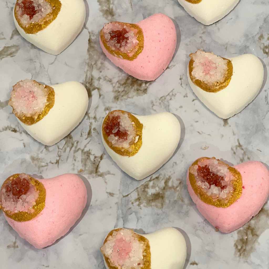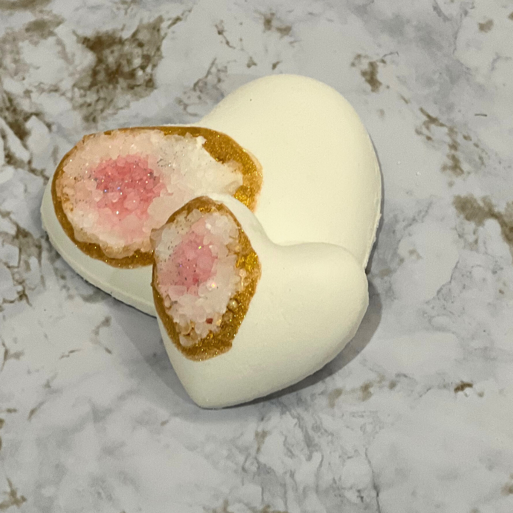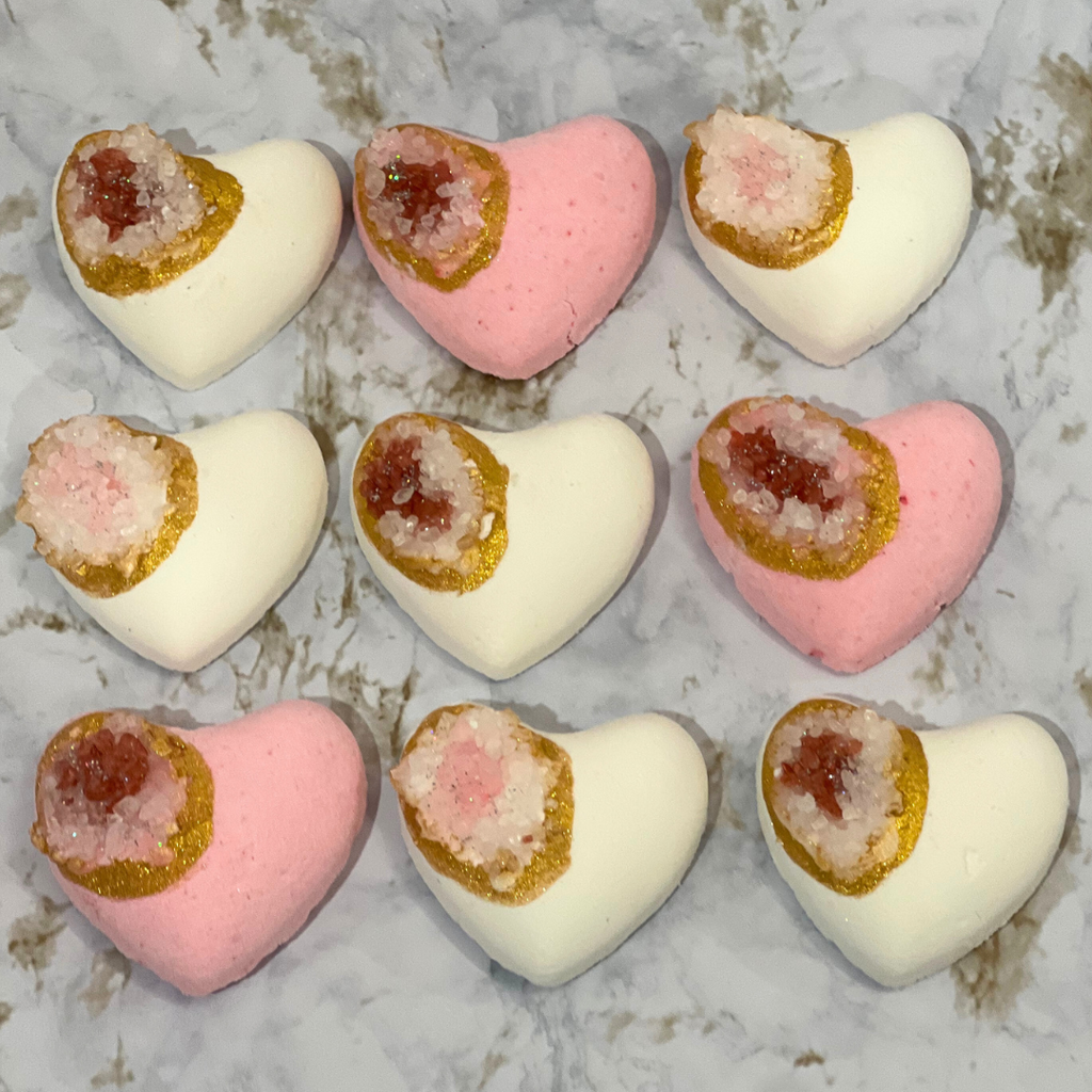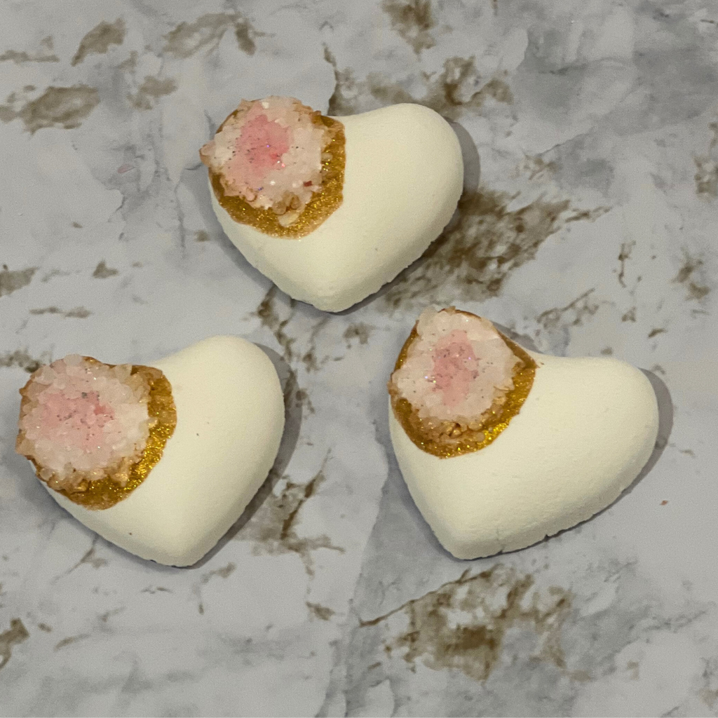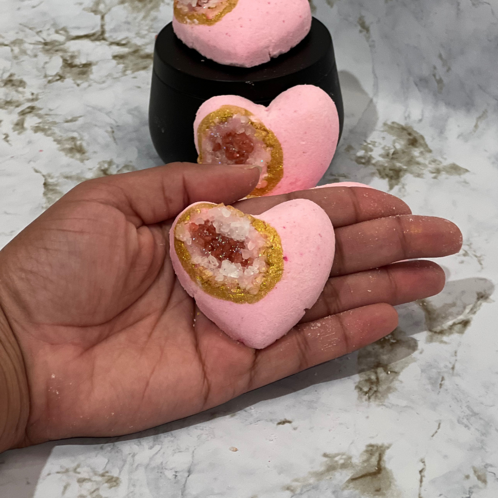 You’ll receive three mini heart geodes, each packed with skin-loving ingredients and a touch of shimmer, giving you all the benefits of our premium bath bombs — just in a smaller dose.