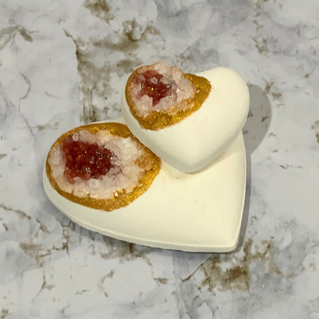 Small in size, big on bliss! These mini geode heart bath bombs come in a set of 3, so pick your colors and pick your scents. This trio delivers the full luxury of our signature heart geode bath bombs in an adorable mini version — perfect for quick soaks, gifting, or sampling a little sparkle.