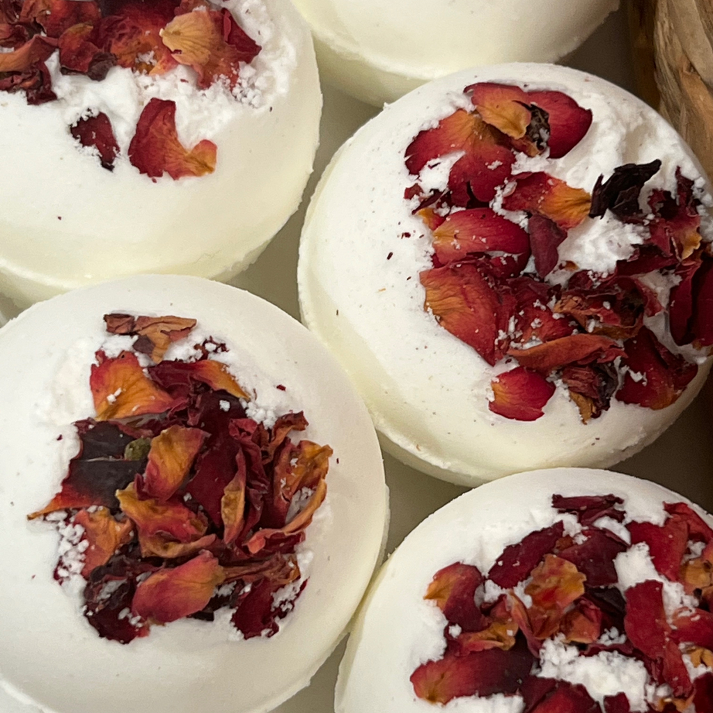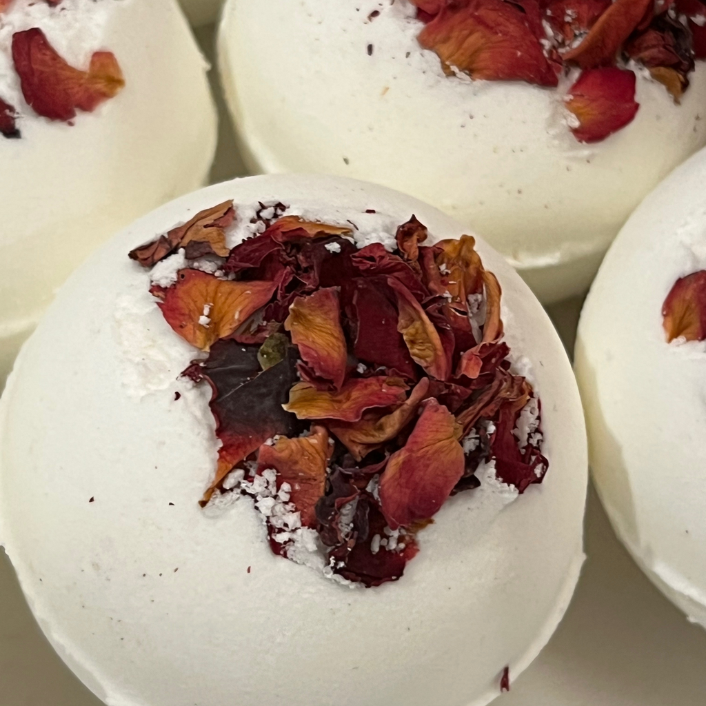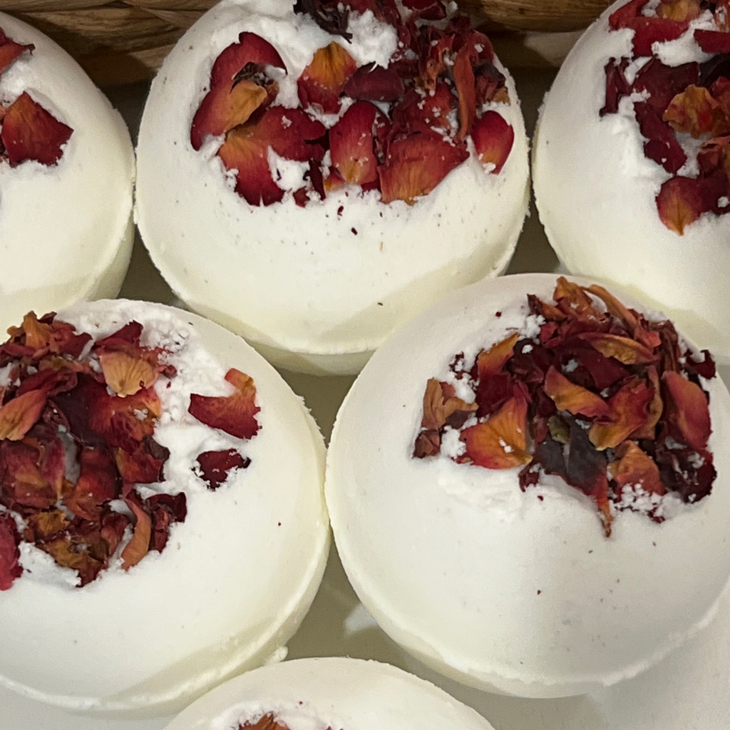 This gorgeous bath bomb is made with dried rose petals, a luxurious bathing experience you will want to relive daily. Infused with gentle scents and moisturizing oils, you will leave your bath feeling soft, luscious, and relaxed! Made with the fragrance oil of your choice for the perfect bath.